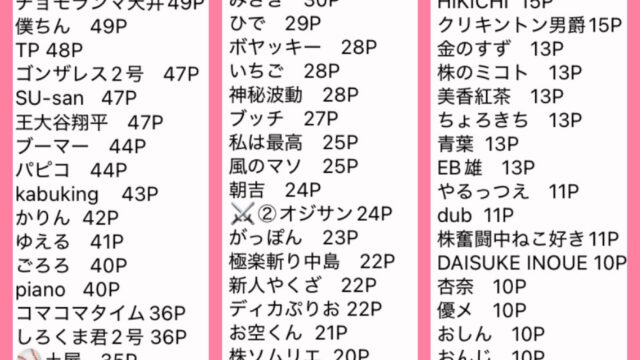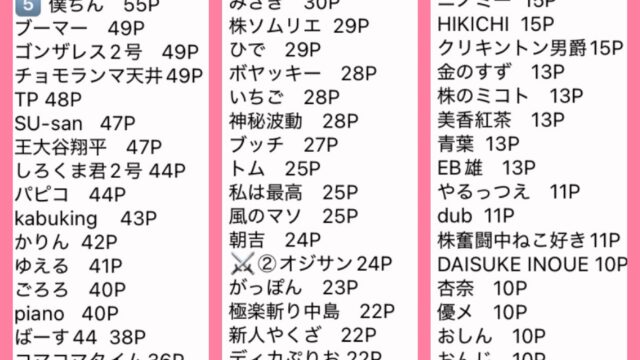 鉄人戦🏆第318回 鉄人戦⑤終値🏆(10/20〜10/24 ) 初優勝🏅 フレイム おめ🎉 10P@onthefiretrack 優勝者へのフォローよろしく👍 2位 株ソムリエ 9P3位 しろくま君2号 8P4位 トム 7P5位 僕ちん 6P6位 ブーマー 5P7位 ばーす44 4P8位 ... 2025.10.25 0鉄人戦