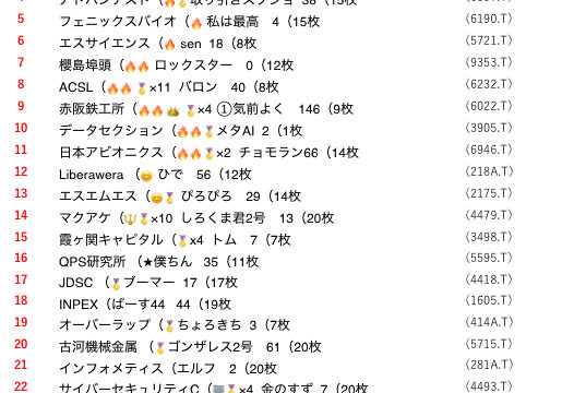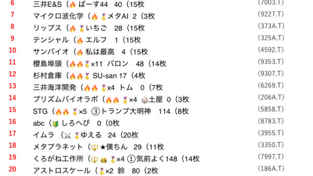 鉄人戦【上弦のタコ🐙】 1️⃣上弦の壱 👑 🏅×4 気前よく 146P @unouno888877772️⃣上弦の弍 🏅×3 オジサン 145P @kabuojisan283️⃣上弦の参🏅×4 トランプ大明神 114P@kR1e91ck0AlZGMA... 2025.10.25 0鉄人戦