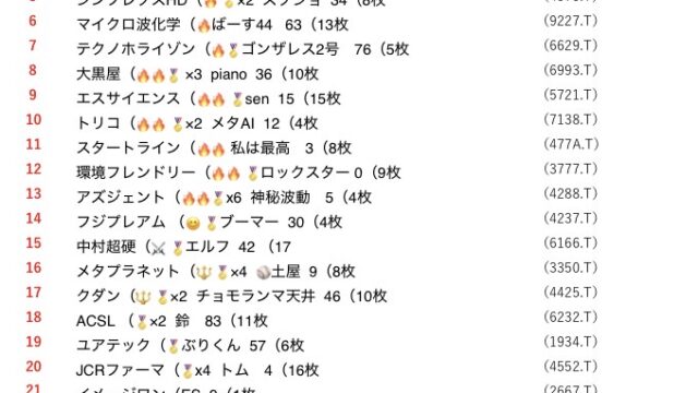 鉄人戦🏆第331回 鉄人戦⑤ 終値🏆(1/26〜1/30 ) 優勝🏅 V13 バロン おめ🎉10P 優勝者へのフォローよろしく👍@baron_sky7 2位 がっぽん 9P3位 ディカぷりお 8P4位 株奮闘中ねこ好き 7P5位 piano 6P6位 僕ちん 5P7位 ES 4P8位 S... 2026.01.30 0鉄人戦