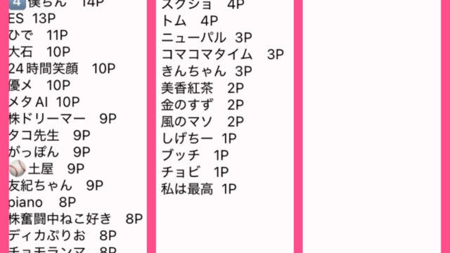 鉄人戦🏆第332回 鉄人戦⑤ 終値🏆(2/2〜2/6 ) 優勝🏅初優勝 24時間笑顔 おめ🎉 10P 優勝者へフォローよろしく👍@jksKkCGxhqnHObI 2位 タコ先生 9P3位 鈴 8P4位 Orz 7P5位 エルフ 6P6位 極楽斬り中島 5P7位 僕ちん 4P8位 バロ... 2026.02.06 0鉄人戦