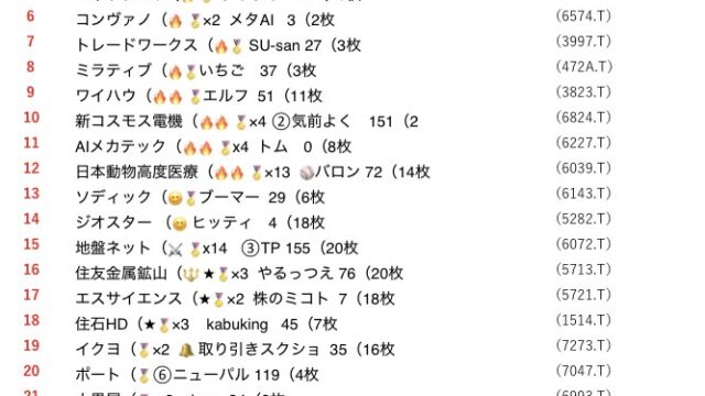 鉄人戦🏆第333回 鉄人戦⑤終値🏆(2/9〜2/13) 優勝 🏅V14 TP おめ🎉10P 2位 株ドリーマー 9P3位 やるっつえ 8P4位 株のミコト 7P5位 kabuking 6P6位 ひで 5P7位 スクショ 4P8位 ニューパル 3P9位 piano 2P10位 大石 1P ... 2026.02.13 0鉄人戦