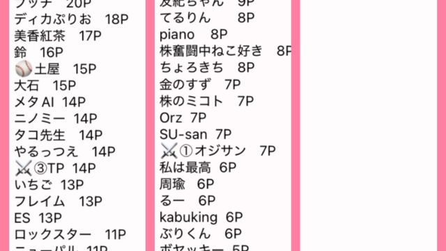 鉄人戦🏆第337回 鉄人戦 ⑤終値🏆(3/9〜3/13 ) 初優勝 🏅 僕ちん おめ🎉10P 2位 あおあし 9P3位 チョモランマ天井 8P4位 ニノミー 7P5位 土屋 6P6位 私は最高 5P7位 トム 4P8位 ディカぷりお 3P9位 金のすず 2P10位 バロン 1P お疲れ... 2026.03.13 0鉄人戦