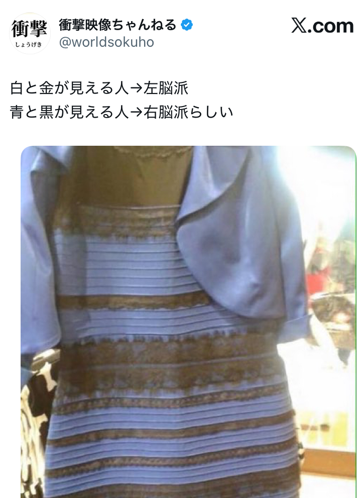 2015年にSNSで拡散し、 白×金 に見える人と 青×黒 に見える人で世界的議論になりました。