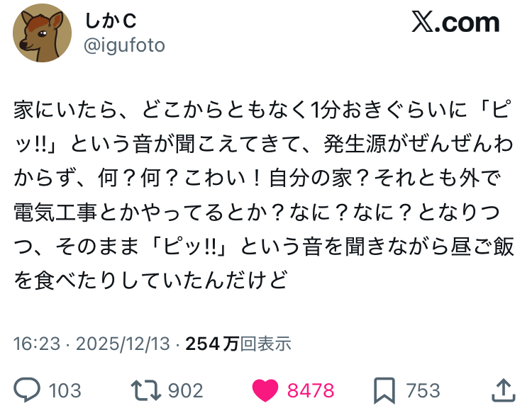 ・多くの家庭でよくある現象です。海外の掲示板などでは夜中に意味不明のビープがずっと鳴ってたという報告が多くあります。火災報知器の電池が切れかけて音が止まらないという話も頻繁に見られます。