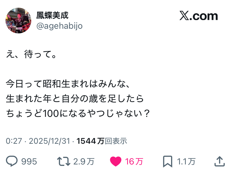 つまり、今年が2025年なら、2025 − 生まれ年の年齢を足すと2025になるのは当たり前、昭和生まれも平成生まれも令和生まれも同じです。