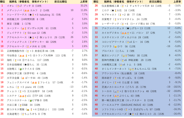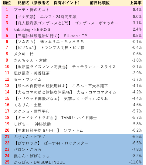 🏆第320回 鉄人戦⑤終値🏆(11/4〜11/7)鉄人戦Processed with MOLDIV 2025.11.07スポンサーリンク優勝🏅 V8 ブッチ おめ🎉 10P@5ROFtJChVv81777優勝者へのフォローよろしく👍2位 エルフ 9P3位 kabuking 8P4位 24時笑顔 7P5位 宮健 6P6位 ゴンザレス2号 5P7位 SU-san 4P8位 株ソムリエ 3P9位 ボヤッキー 2P10位 メタAI 1Pお疲れ様でした、良い週末を😊Processed with MOLDIV