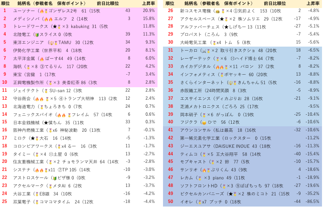 🏆第321回 鉄人戦 ⑤終値🏆(再)(11/10〜11/14 )鉄人戦Processed with MOLDIV 2025.11.14スポンサーリンク優勝🏅V4 オジサン おめ🎉10P@kabuojisan28優勝者にフォロバよろしく👍2位 宮健 9P3位 ニノミー 8P4位 ばーす44 7P5位 ゆえる 6P6位 トム 5P7位 24時間笑顔 4P8位 コマコマタイム 3P9位 スクショ 2P10位 僕ちん 1Pブーマーさん銘柄は、日東電工ではなく日本精工でもなく、日東精工とのこと順位の変動です🙇♂️お疲れ様でした、良い週末を😊Processed with MOLDIV