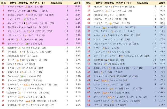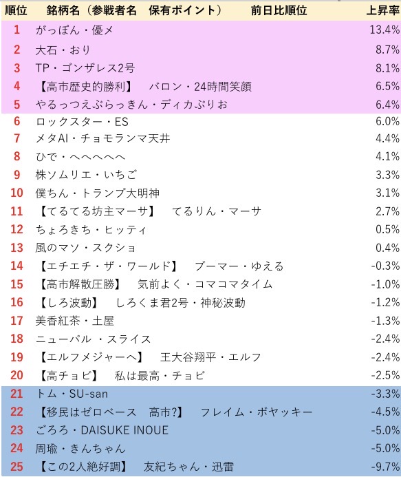 🏆第329回 鉄人戦⑤ 終値🏆(1/13〜1/16 )鉄人戦Processed with MOLDIV 2026.01.16スポンサーリンク優勝 🏅V2 優メ おめ🎉 10P@mrx180_977優勝者へのフォローよろしく👍2位 大石 9P3位 バロン 8P4位 ES 7P5位 やるっつえぶらっきん 6P6位 僕ちん 5P7位 TP 4P8位 いちご 3P9位 風のマソ 2P10位 チョビ 1Pお疲れ様、良い週末を😊Processed with MOLDIVScreenshotScreenshot