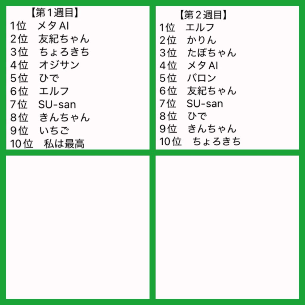 月初週での戦いが対象となります。ポイント増減も月刊レース分が反映されます。週ごとに途中経過を示していきます。
