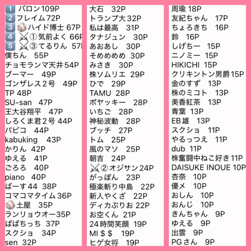 優勝者は10P、、、以下1Pと集計しています。