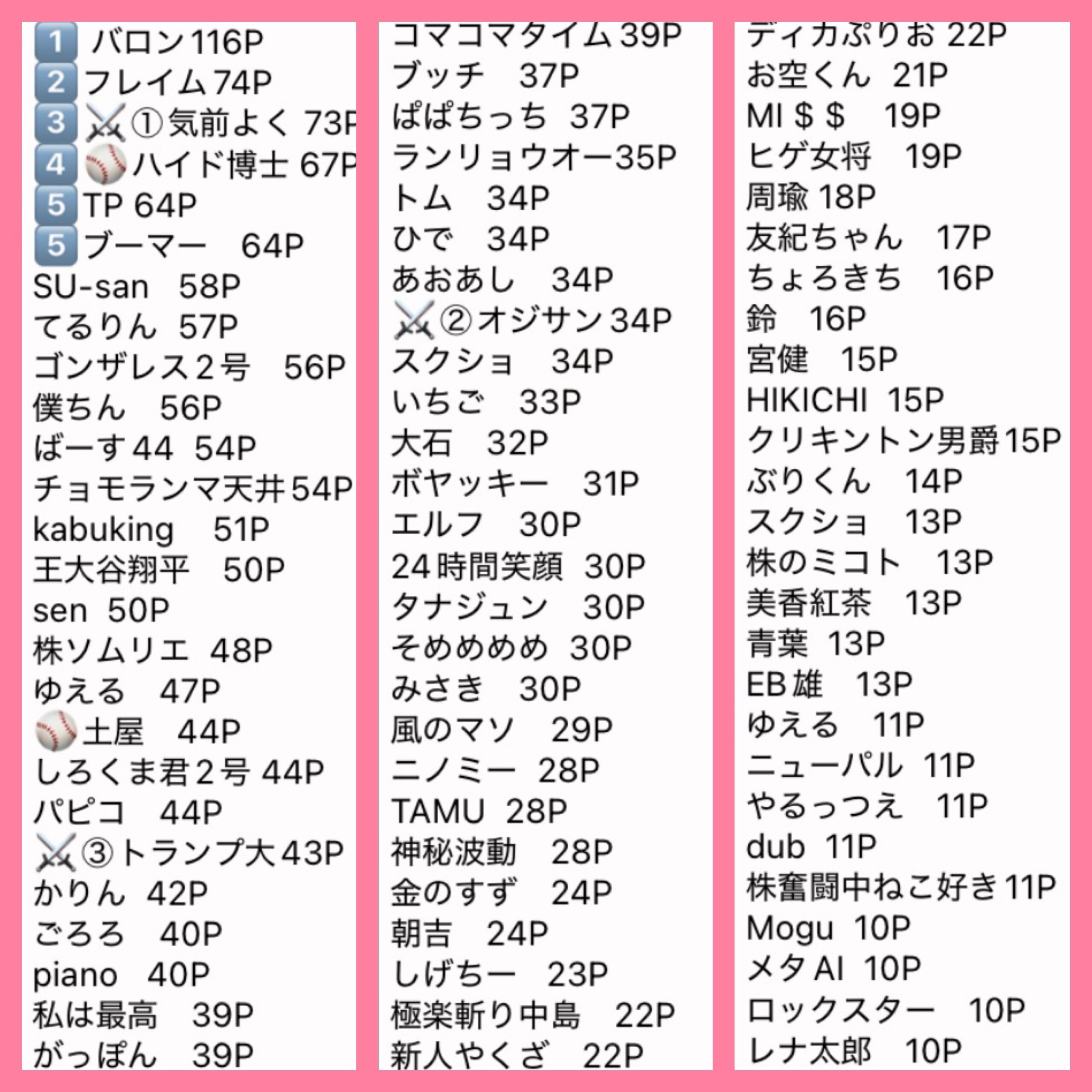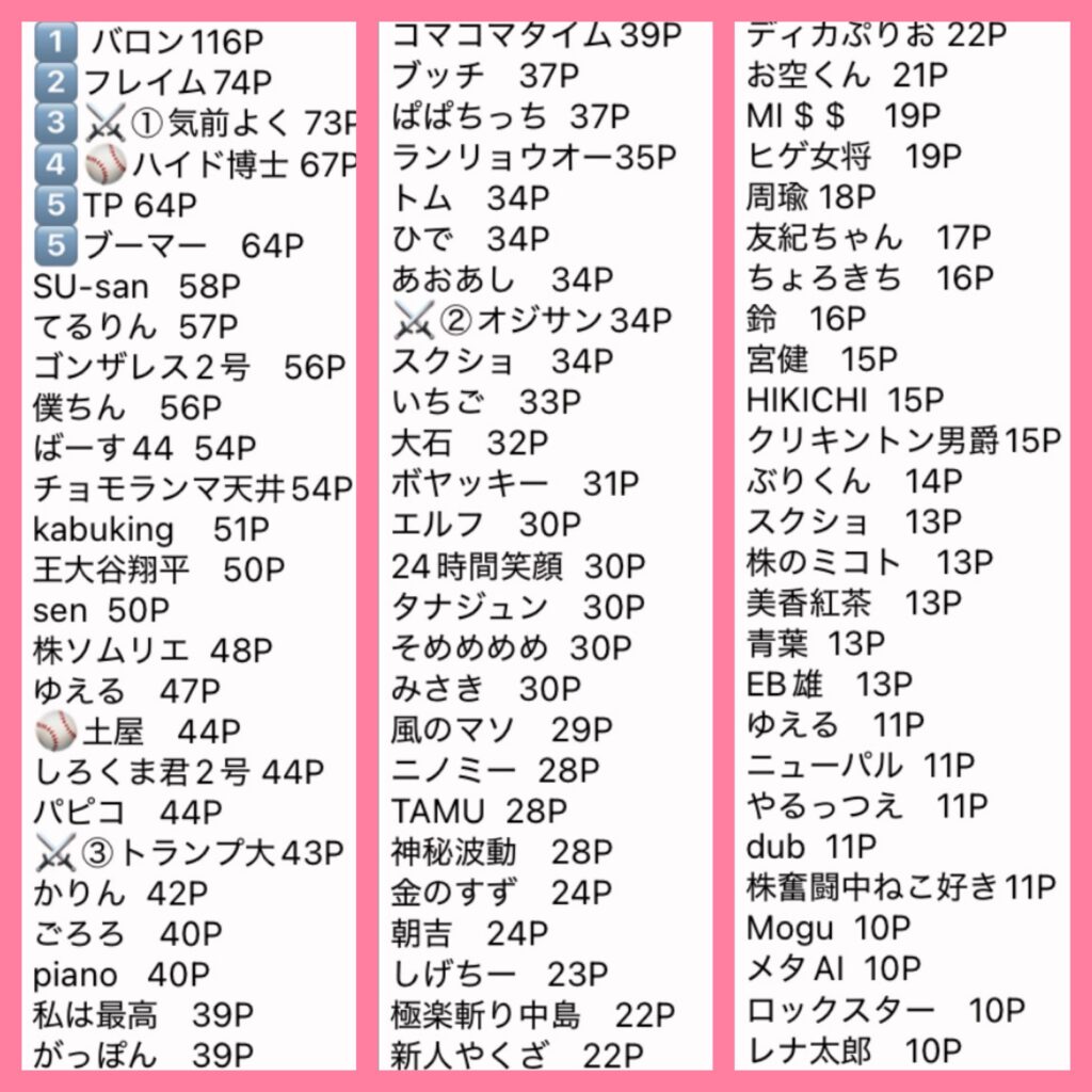 優勝者は10P、、、以下1Pと集計しています。