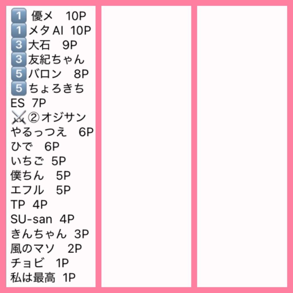 優勝者は10P、、、以下1Pと集計しています。