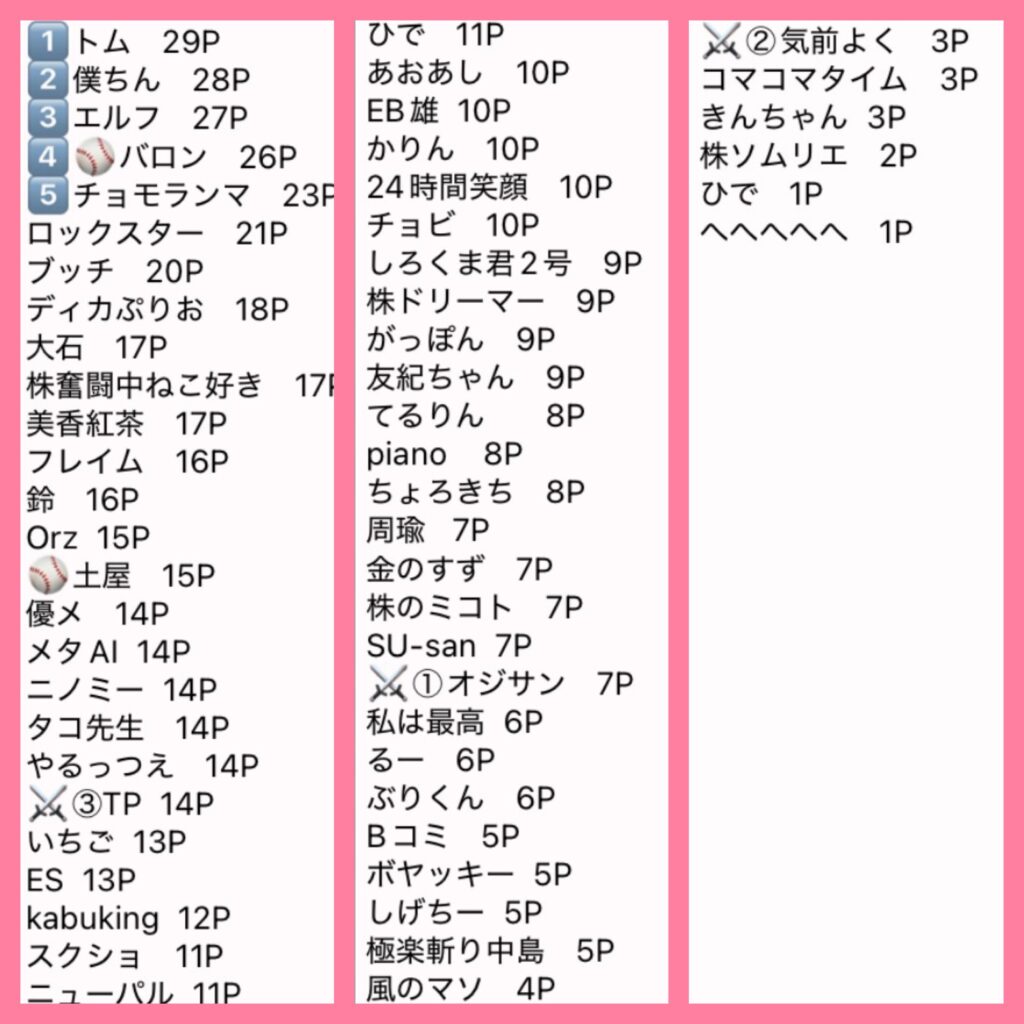 ここでの順位はポイント減少は考えず獲得だけです☝️