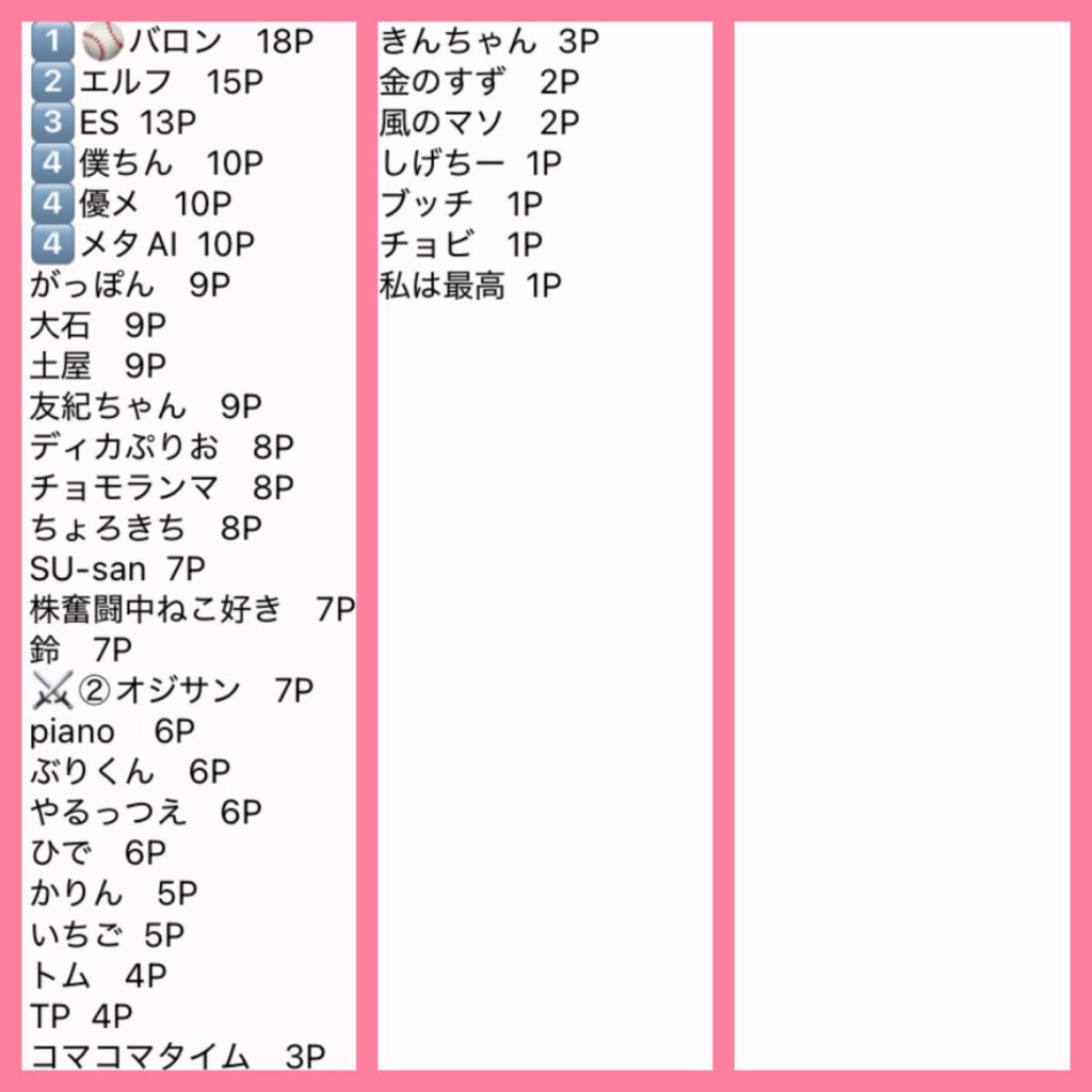 優勝者は10P、、、以下1Pと集計しています。