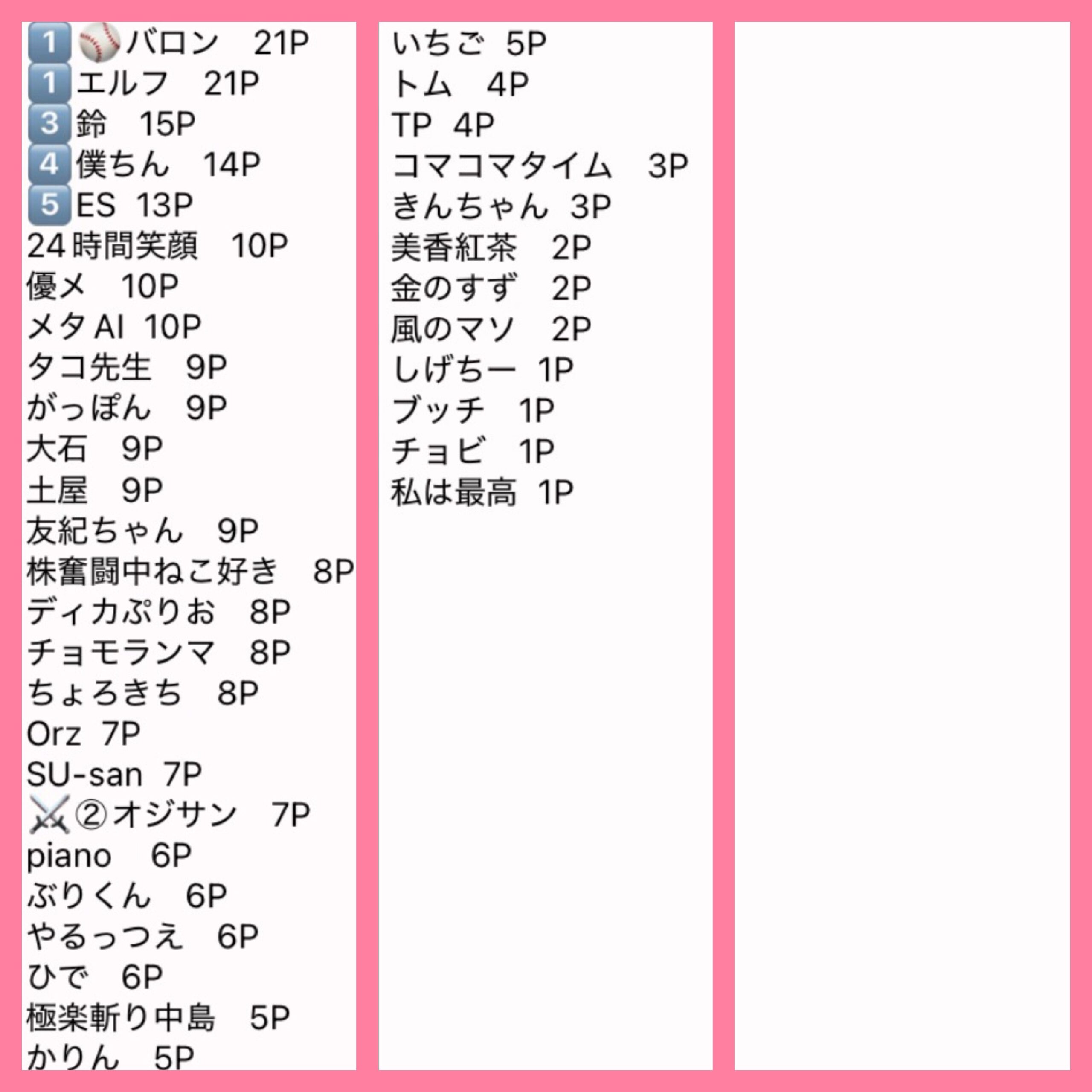 優勝者は10P、、、以下1Pと集計しています。