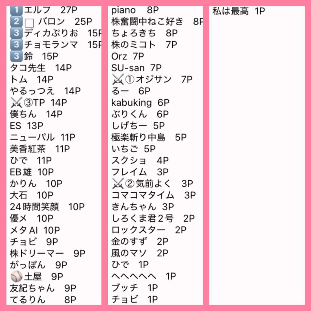 優勝者は10P、、、以下1Pと集計しています。