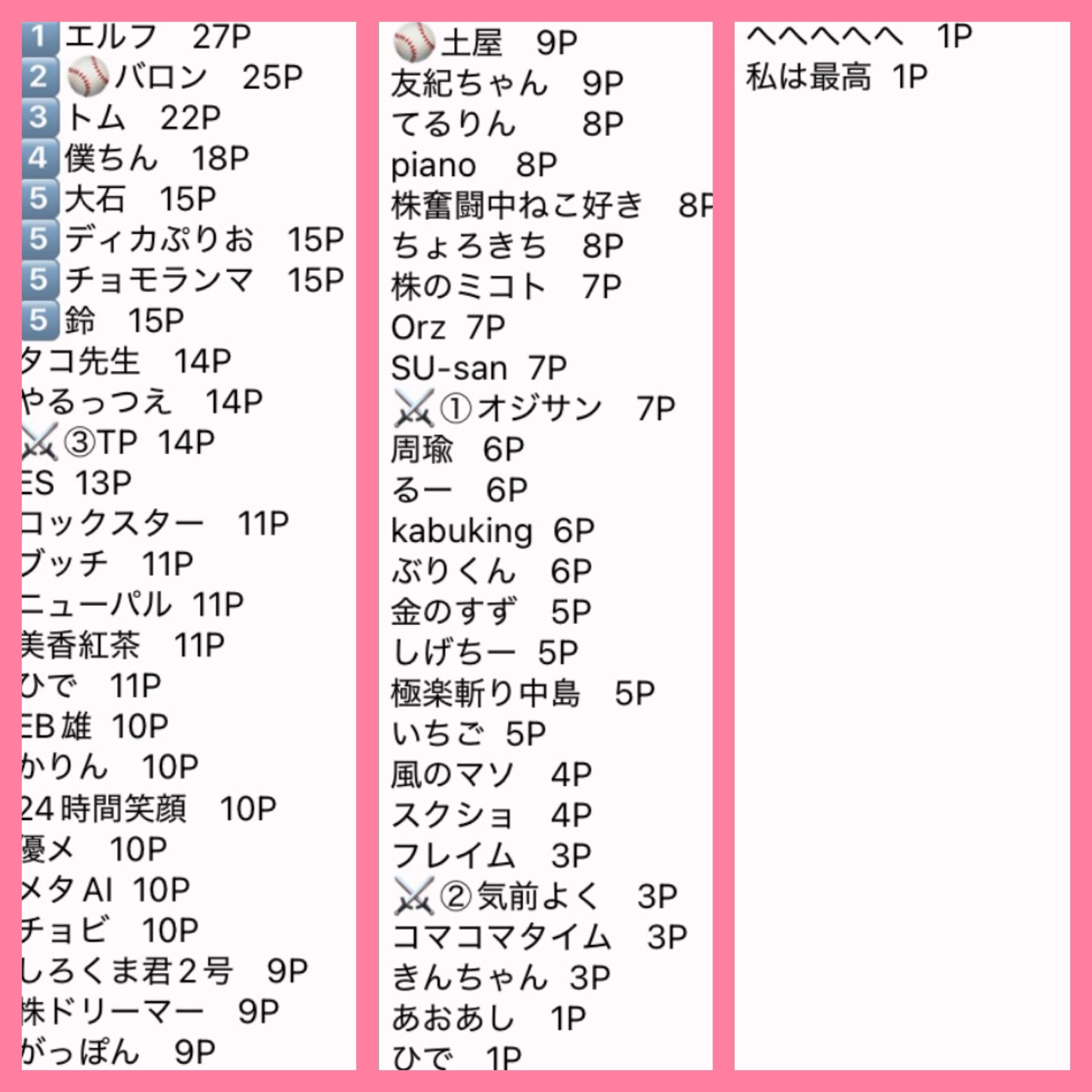 優勝者は10P、、、以下1Pと集計しています。