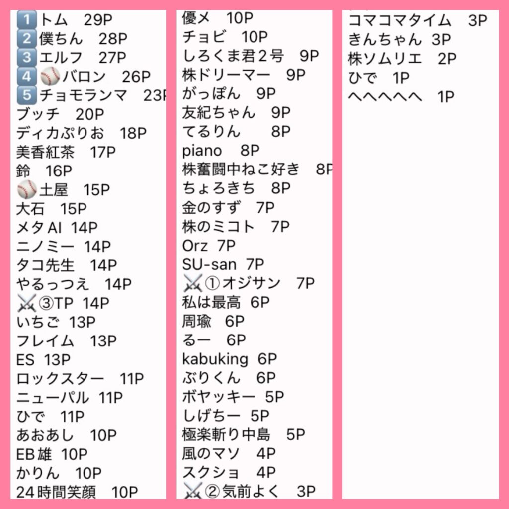 優勝者は10P、、、以下1Pと集計しています。
